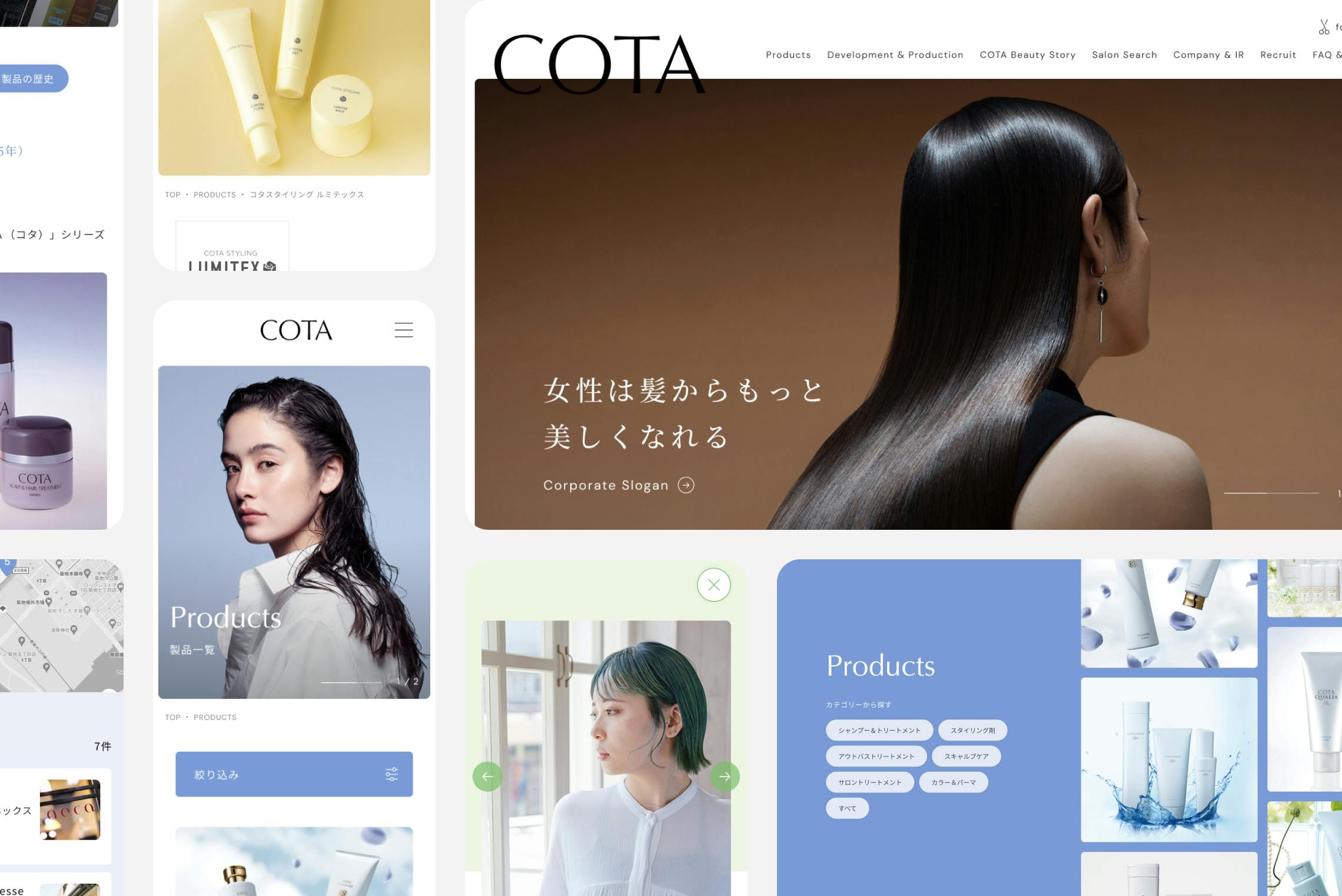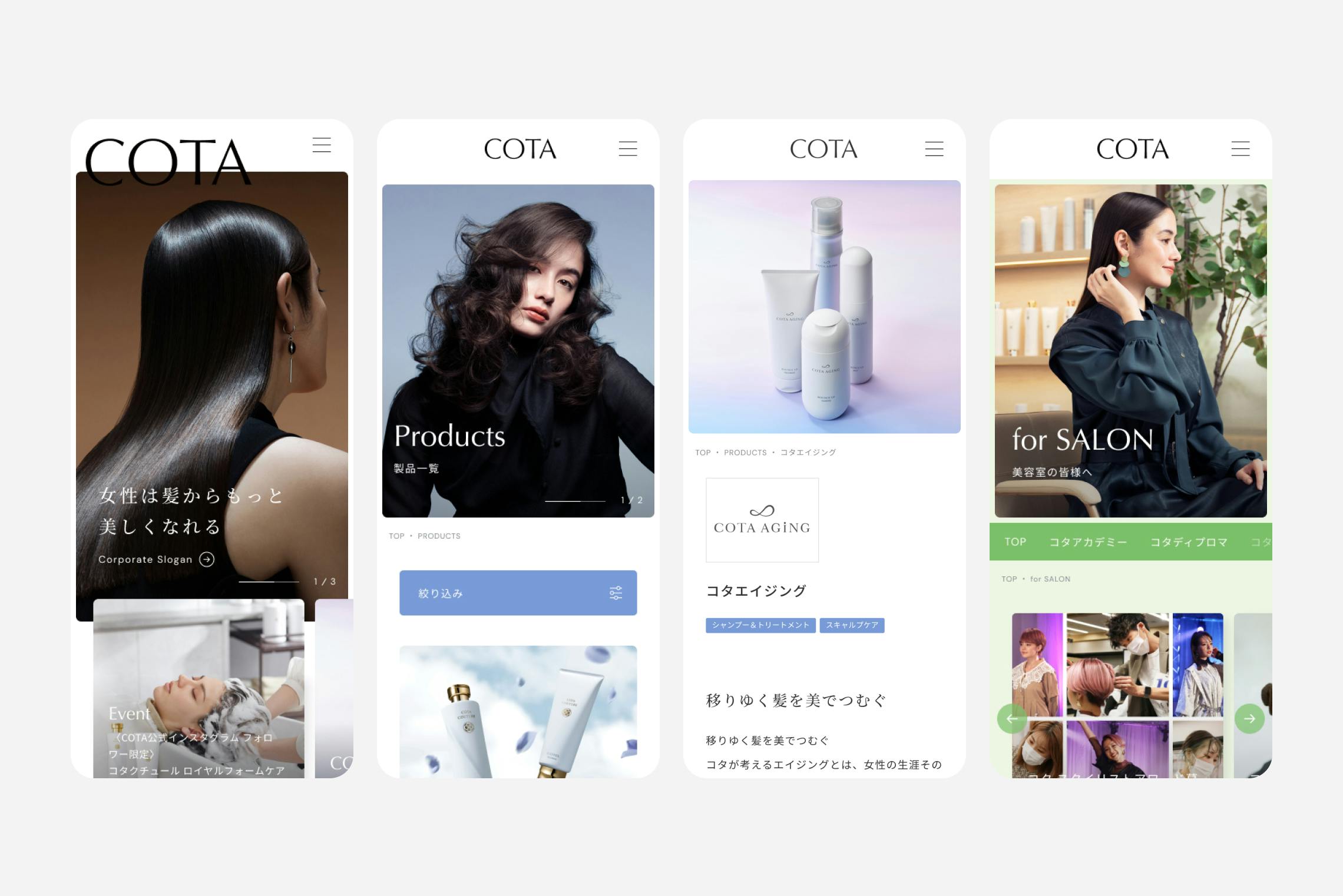 「女性は髪からもっと美しくなれる」をコーポレートスローガンに、美容室向けの頭髪用化粧品を製造・販売するCOTA。 シーズンビジュアル、コーポレートサイト制作を担当しております。
